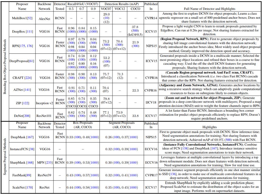 表 5:使用 DCNN 的目标提议方法汇总。蓝色数字表示目标提议的数量。除非另有说明,在 COCO 上的检测结果都使用了 mAP@IoU[0.5, 0.95]。