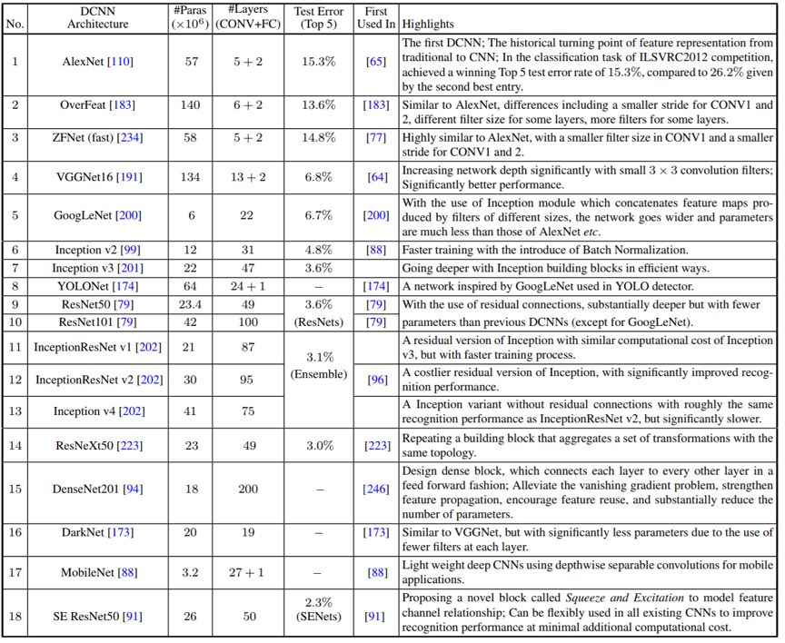 表 2:常用于一般目标检测的 DCNN 架构。对于 #Paras 和 #Layers 的统计数据,我们没有考虑最后的 FC 预测层。「Test Error」一列给出了在 ImageNet1000 上的 Top 5 分类测试误差。解释:OverFeat(准确的模型)、DenseNet201(Growth Rate 32, DenseNet-BC)以及 ResNeXt50(32*4d)。