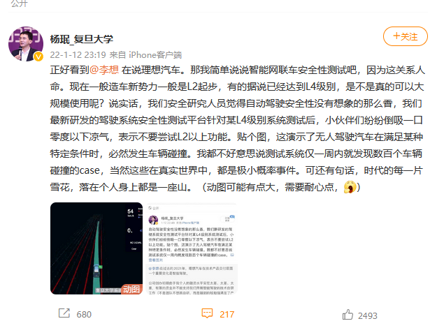 但是在该微博发布的后一天,复旦大学的杨珉就李想的理想汽车的智能驾驶,在微博上谈论了一下他对自动驾驶的看法,他表示智能网联车安全性测试,一般的汽车只能达到L2级别,而有的据说能出厂能达到L4,然而事实的真相是,那些据说是L4安全级别的汽车根本过不了系统测试。自动驾驶会再某些情况下,导致必然的撞车事故。