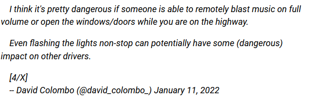 David Colombo还表示他可以在汽车行驶中远程播放音乐,并调整音量或打开车窗或车门。