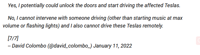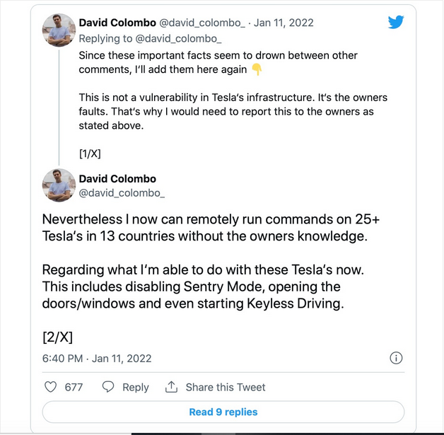 David Colombo后来在Twitter表示,他已经与特斯拉的安全团队取得了联系,并且他表示特斯拉的安全团队正在调查这个问题,该团队会向他反馈最新信息。