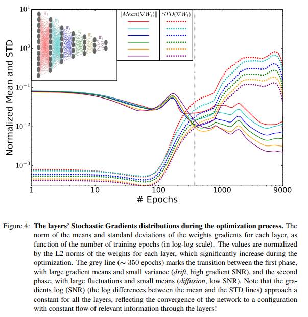 作者在论文中指出,他们在实验中首次观察到了随机梯度下降优化过程中两个独特的阶段,经验误差最小化(ERM)和表示压缩。上图展示了SGD过程中信息逐层传递收敛的情况。