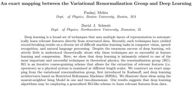 物理学家David Schwab和Pankaj Mehta在2014年的论文,证明在特定情况下深度学习等同于物理中的重整化技术,这让Tishby注意到信息瓶颈理论与深度学习之间的关联