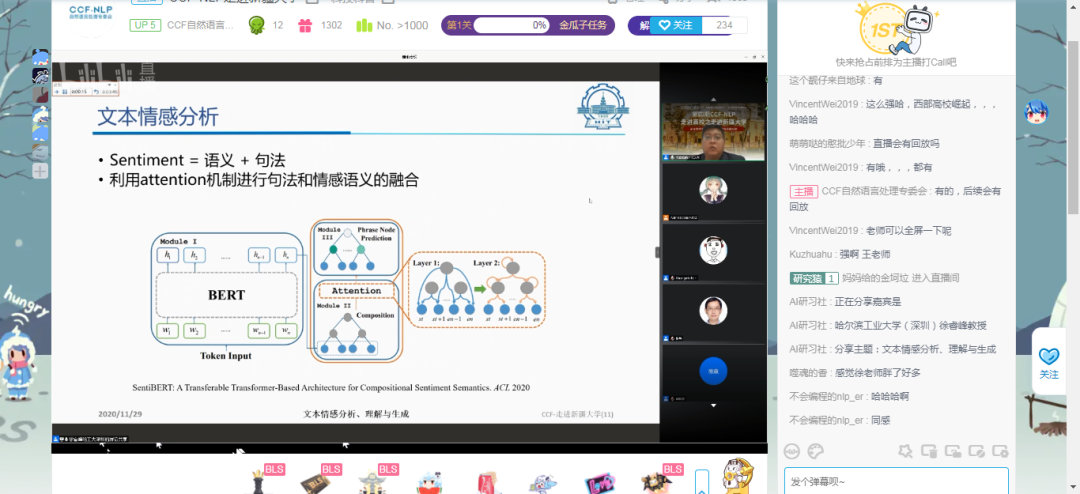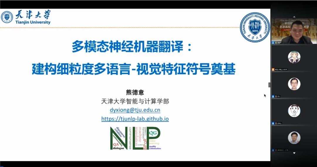 在本次报告会上,专家们围绕《文本情感分析、理解与生成》、《知识与预训练模型》、《多模态神经机器翻译:建构细粒度的多语言-图像特征符号奠基》等NLP热门话题展开了精彩报告。活动通过AI研习社和Bilibili等平台线上直播观看的方式进行,同学们互动踊跃。