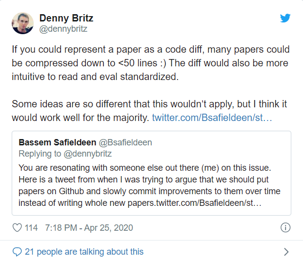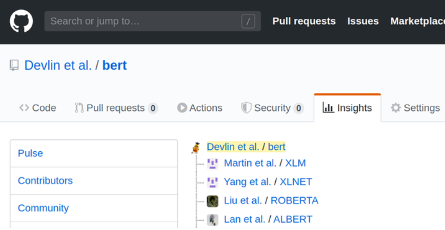 最近在Twitter上发现了一个有趣的话题,假设有这样一个场景,论文研究在GitHub上发布,而后续论文则会提交与原始论文不同之处。在人工智能机器学习领域,信息过载一直是一个大问题,每个月都有大量新论文发表,这样的通过commit history展示方式或许会给你带来眼前一亮。下面我们就来蹭蹭大明星BERT的热度,来看看这一场景应用到BERT系论文会是什么样子的?