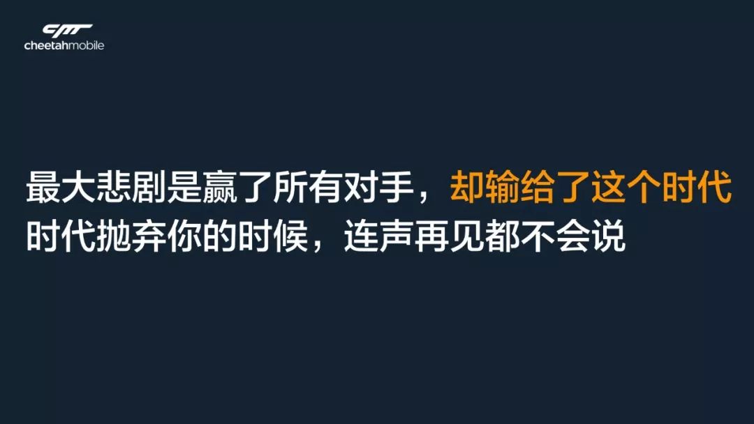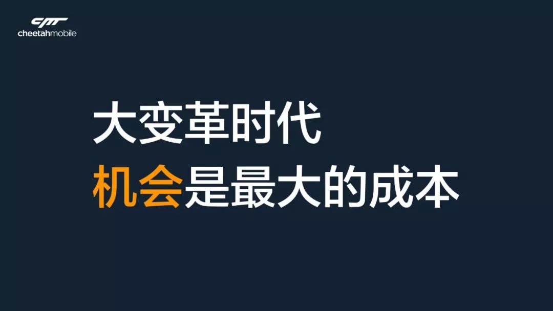 现在结果如何呢?去年,也就是2017,猎豹整体收入近50亿规模,而瑞星前年只有几千万收入了。这就是一个时代的变化——大潮来临,唯有拥抱。