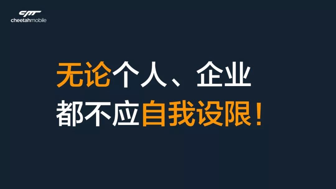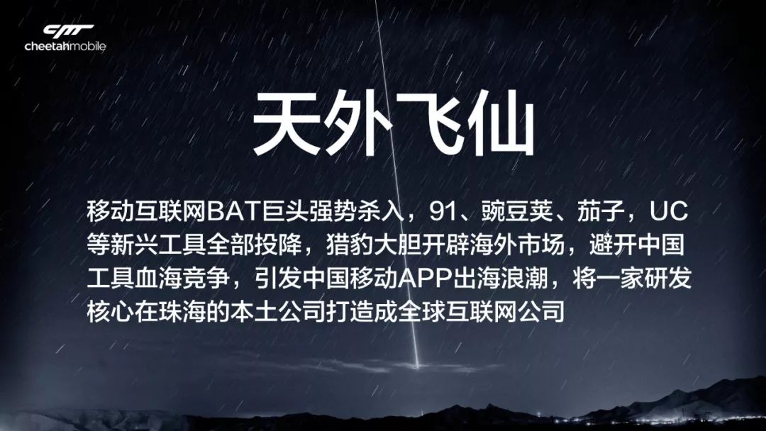 互联网时代,我们用PC免费模式重构了商业,从那一批古董级企业中幸存了下来;等到移动互联网竞争开始加剧,一批安全产品,像91、豌豆荚、茄子、UC等等,各种小的安全工具,巨头杀入时,要么投降,要么卖掉。还是猎豹,杀出重围。也就是传说中的那个小酒馆的故事,我们决定全力以赴,all in海外移动。