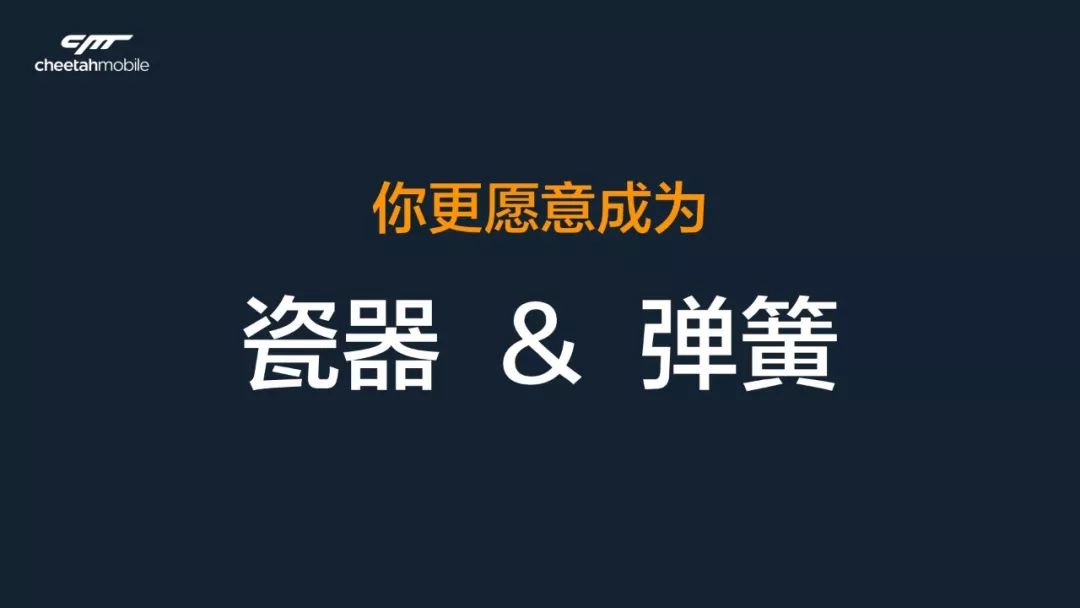 猎豹过去七年,尤其2017年,团队的成长,变化很多。我希望,我们能成为弹簧一样的人。把所有压向你的困难、遭遇的失败,都变成自我吸收的一种机会,一种途径,一种养分。