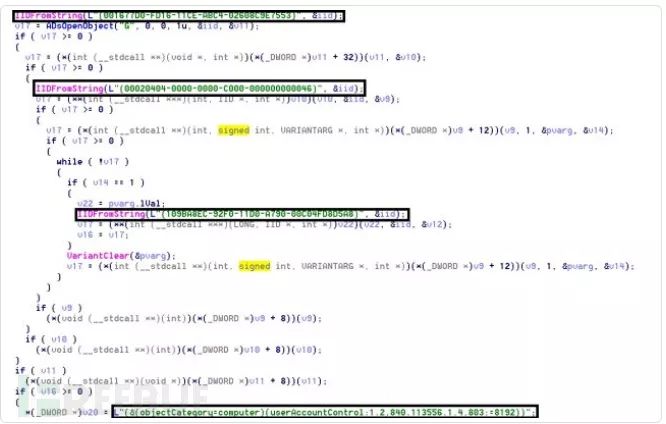 wormDll32模块尝试使用NetServerEnum和LDAP查询识别网络中的服务器和域控制器。2017年,Flashpoint的安全研究人员首次观察到 Trickbot的蠕虫传播能力。