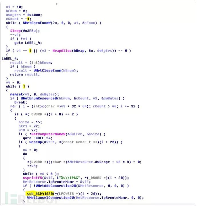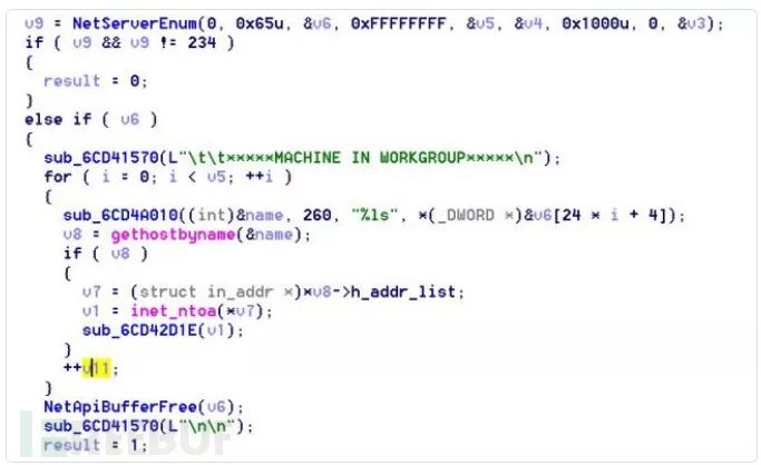 图8.使用WNetEnumResourceW和GetComputerNameW枚举和标识已连接系统的代码的屏幕截图