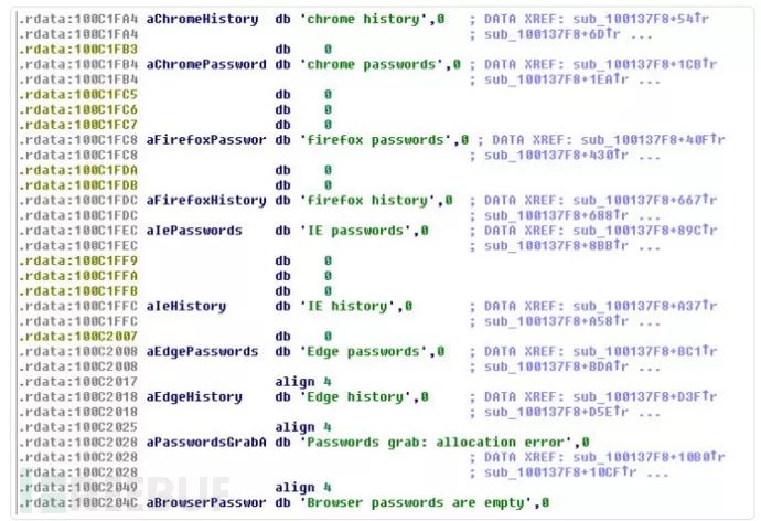 除了从应用程序窃取凭据外,它还从几个流行的Web浏览器窃取以下信息,例如Google Chrome,Mozilla Firefox,Internet Explorer和Microsoft Edge: