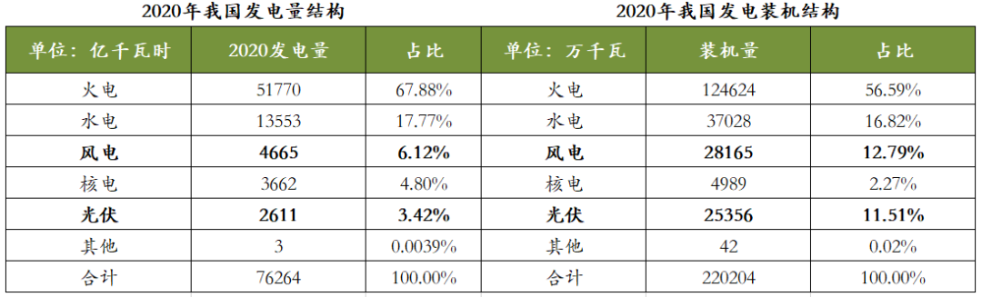 从2020年我国的电力供应结构来看,目前清洁能源发电量在我国总发电量占比为32%,其中光伏与风电合计占比仅不到10%;从装机量来看,清洁能源装机占比43%,其中光伏与风电合计装机量为24.31%。综合来看,目前我国清洁能源发电仍然以水电为主,光伏和风电的实际渗透率处于较低的水平。