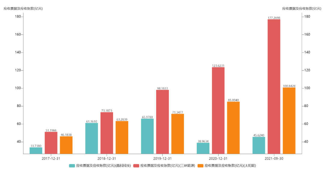 一般来说,光伏电站运营企业在销售电力时已经把对应的补贴确认为营业收入,因此国家未发放到账的补贴均作为应收账款列示。目前各家新能源运营商账面积累了巨量的应收账款,虽说减值的可能性非常低,但却严重拖累了公司资金的运用效率,迫使运营商每年多支付数亿元的利息费用。以太阳能为例,截止2021年三季度,太阳能账面应收款100.84亿元,占总资产比例达到25%。