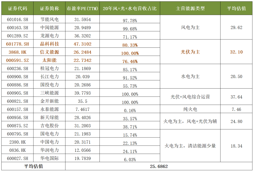 从不同类型的电站运营商的估值水平来看,光伏运营商与风电运营商的估值接近,综合性新能源运营商的估值最高,火电占比高的运营商估值最低。
