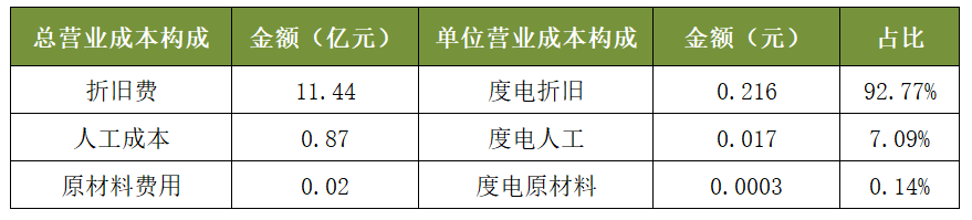 成本端:光伏电站为重资产运营,且基本不需要投入原材料,因此光伏电站的营业成本主要由固定资产折旧构成。以太阳能为例,截止2021年中报,太阳能固定资产总投入额已经达到332.57亿元,其中光伏组件等发电设备294.38亿元,房屋及建筑物17.95亿元。在巨大的固定资产投入额之下,每年由光伏组件和土地资源产生的固定资产折旧费就成了企业最主要的成本来源,如下表所示,2020年,太阳能折旧费用高达11.44亿元,度电折旧占比为92.77%。