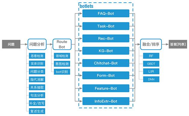 上面的各种机器人都是为解决某类特定问题而被提出的,我们前面也分开介绍了各个机器人的主要组件。但这其中的不少组件在多种机器人里都是存在的。例如知识图谱在检索型、任务型和闲聊型机器人里也都会被使用。