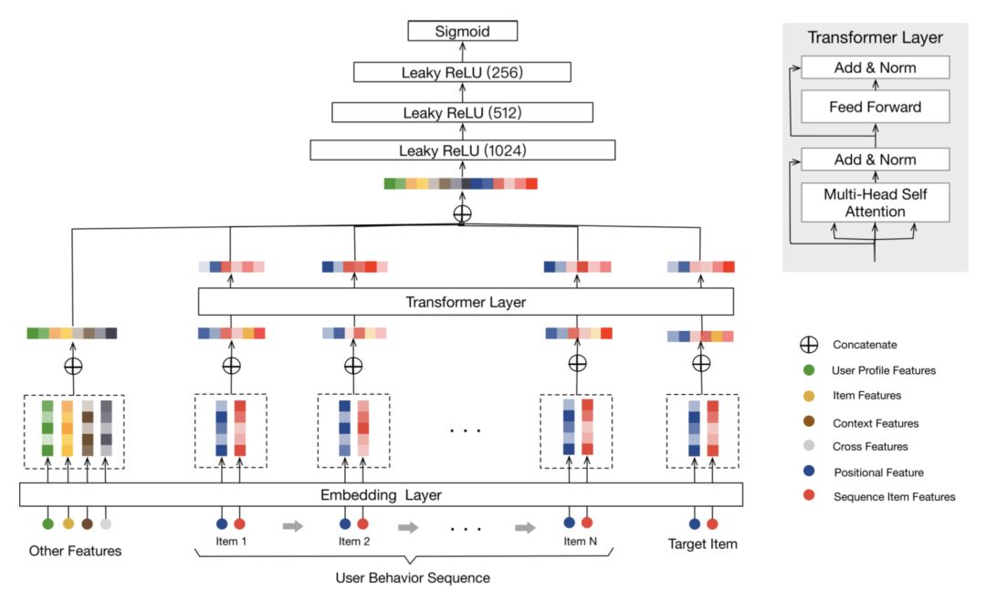 4. BST模型通过Transformer模型来捕捉用户历史序列中各个item的关联特征,并且通过加入待推荐的商品item,也可抽取出行为序列中商品与待推荐商品之间的相关性。