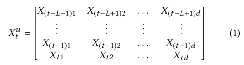 其短期兴趣建模过程如下:假定使用用户最近的 L 条行为记录来计算短期兴趣。可使用X表示整个物品集合的embedding,那么,用户 u 在 t 时刻的前 L 条交互记录所对应的embedding表示如下: