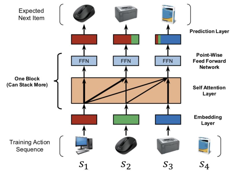 位置embedding:因为self-attention并不包含RNN或CNN模块,因此它不能感知到之前item的位置。本文输入embedding中也结合了位置Embedding P信息,并且位置embedding是可学习的。