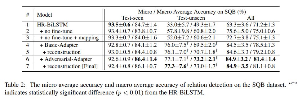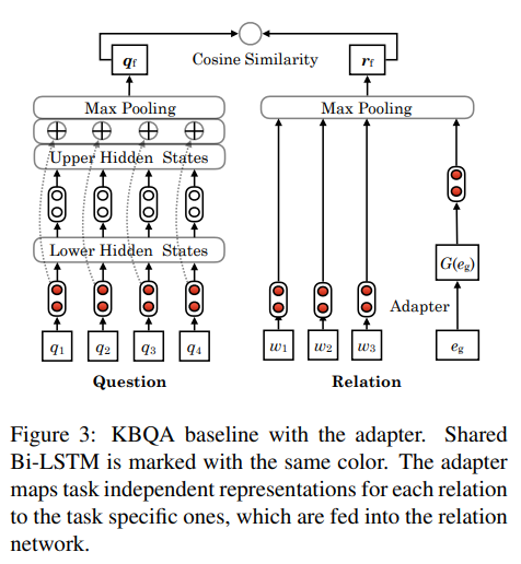 和 (Yu et al.,2017) 类似,我们使用一个问句网络来编码问句,使用关系网络来编码关系,最后使用余弦相似度计算其距离,得到关系检测的结果。与之不同的是,我们在关系的全局表示中加入之前提出的 Adapter,在测试时对于已登录和未登录关系均使用 Adapter 映射后得到的表示。Adapter 的输入我们采用 JointNRE(Han et al., 2018)训练得到的表示,因为他能够将关系和词表示学习到同一空间。