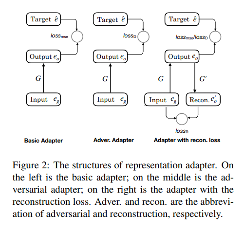 我们的 Adapter 采用一层线性神经网络将关系表示从通用的表示空间,映射到任务特定的表示空间。通用空间的表示通过一些无监督的算法在知识库层面训练得到,任务特定空间具有的表示通过具体的下游任务训练得到。我们提出的 Adapter 与简单增加网络层数不同的一点在于,我们使用特殊设计的损失函数来优化这一映射,而不是简单的将其作为下游任务网络的一部分进行优化,实验部分我们会比较这一点的。损失函数可以使用任何评价两个表示相似程度的指标。对于基本 Adapter(Basic Adapter) 我们使用均方误差来优化这一映射。我们也提出了使用对抗损失来优化 Adapter 的参数。注意到上述两种方法均只能利用已登录关系的表示,而忽视了未登录关系所具有的有效信息,我们增加一个反向 Adapter 将正向 Adapter 得到的表示映射回通用表示空间。