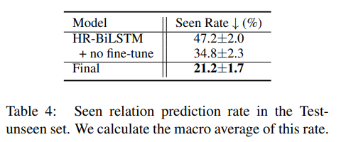可以看出,基线模型(HR-BiLSTM)在已登录关系上达到很高的性能,但是对于未登录关系模型的检测能力很弱。不微调关系表示(第 2 行)可以初步提升模型对于未登录关系检测的性能,仅仅增加一层线性映射(第 3 行)不能很好的提升未登录关系上的性能。这些结果都验证了我们的动机。