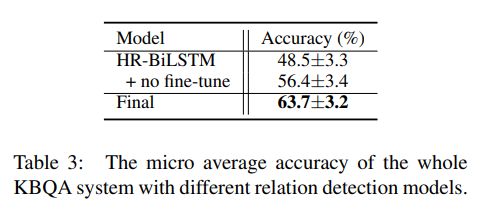 可以看出,我们的模型可以显著的提高知识库问答的精度。和之前的结果对比,我们发现确实是关系检测性能的提升导致知识库问答的提升。