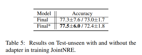 我们也考察了模型对于未登录关系错误的选择已登录关系的比例(seen rate),从下表中可以看出,提出的Adapter 可以减弱模型选择已登录关系的趋势,帮助模型在已登录和未登录关系之间进行公平的选择。