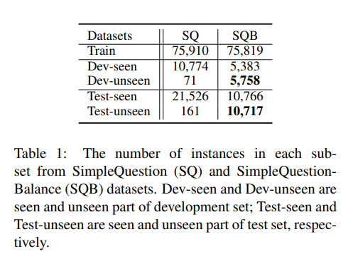 由于 SimpleQuestion 不能很好的评估未登录关系检测,我们重新组织了 SimpleQuestion 的训练,开发,测试集,得到新的数据集 SimpleQuestion-Balance(SQB)。新数据集的开发集和测试集中已登录和未登录关系的比例大致相当。同时,我们也保持了和原有 SimpleQuestion 相同的数据集划分比例。