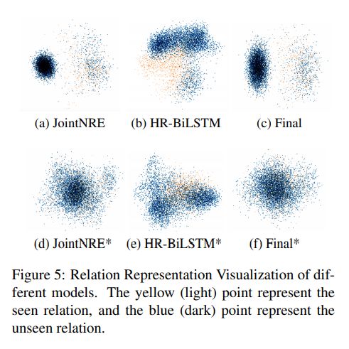 最后我们可视化了JointNRE,HR-BILSTM,和 Adapter 生成的关系表示(下图a,b,c)。可以看出 JointNRE 中已登录和未登录关系分布均匀,而HR-Bilstm 会使得已登录和未登录关系之间存在明显的界限,使用 Adapter 得到的表示可以保留这种均匀的分布。我们也注意到图 a 中有一些关系存在明显的聚集现象,这可能由于训练 JointNRE 时,存在一些未被语料覆盖的关系。对此,我们使用提出的 Adapter 从 TransE 表示映射到 JointNRE 表示,进而得到这部分未登录关系的表示,称其为 JointNRE*,使用这一表示训练的基线模型和 Adapter 则为 HR-BiLSTM*和 Final*。其可视化表示为下图的d,e,f。可以看出JointNRE*得到的关系表示更加均匀。从下表也可以看出,该表示训练得到的 Adapter 可以进一步提高 未登录关系上的性能。