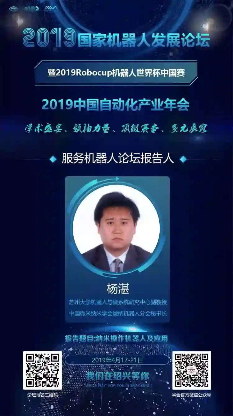 杨湛,名古屋大学工学博士,苏州大学机器人与微系统研究中心副教授,中国微米纳米学会微纳机器人分会秘书长、IEEE高级会员、IEEE NTC管理委员会委员。发表各类学术论文50余篇。受邀在各种学术会议做学术报告10余场。主持国家自然科学基金青年项目1项(已结题)、国家自然科学基金面上项目1项(在研)、参与国家自然科学基金重点项目1项、主持国家高科技计划(863)子课题一项,主持国家重点研发项目课题1项。