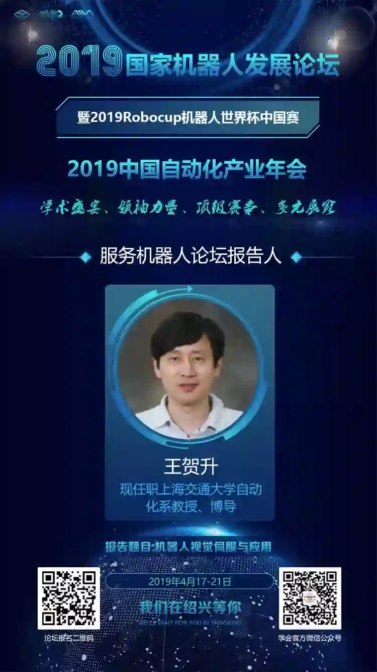 王贺升,现任职上海交通大学自动化系教授,博导。国家优秀青年基金获得者。2002年毕业于哈尔滨工业大学,2004及2007年于香港中文大学分别获得硕士及博士学位。近年来,在国内外刊物和会议发表SCI/EI索引论文100多篇,其中SCI索引40多篇。已获国家发明专利授权20多项。2014年获得上海市青年科技启明星A类。2017年获得国家优秀青年基金。作为项目负责人,主持包括国家自然科学基金联合基金重点项目等多个项目。曾担任2014国际机器人及仿生学大会(IEEE ROBIO2014)的大会程序主席(Program Chair), 2016年国际实时计算与机器人大会(IEEE RCAR2016)的大会总主席(General Chair), 将担任2019年国际先进智能机电系统(IEEE AIM2019)的大会程序主席。目前担任国际期刊IEEE Transactions on Robotics,Assembly Automation,International Journal of Humanoid Robotics的副编辑(Associate Editor),IEEE机器人及自动化学会技术委员会委员。研究领域:视觉伺服,手术机器人,机器人控制,计算机视觉。现为IEEE高级会员。