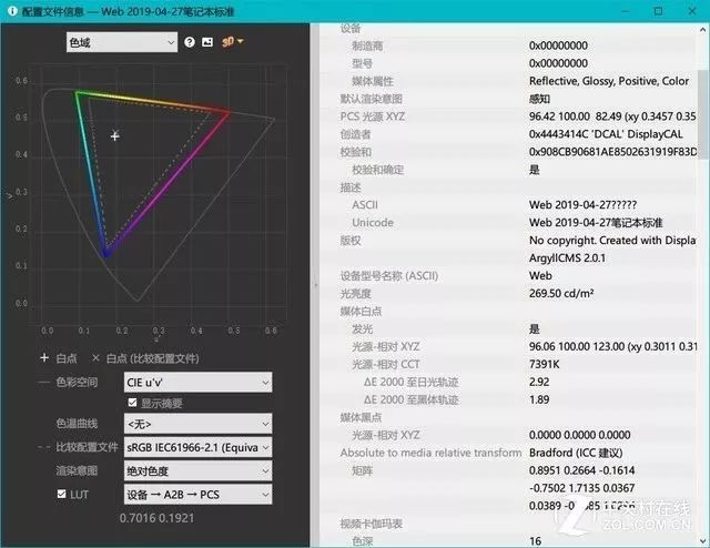 我们也使用仪器对这块屏幕的素质进行了实测,结果如下。