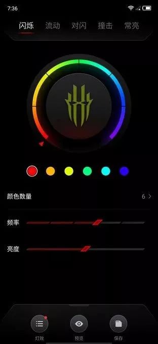 在灯效编辑器2.0中,我们可以看到灯效拥有闪烁、流动、对闪、撞击、常亮这5种模式,色彩和亮度也能无级调节下面让我们来演示一下。