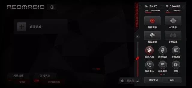 红魔还拥有一键开启的REDMAGIC游戏空间,大部分硬件参数,包括风扇开关都能自定义控制。