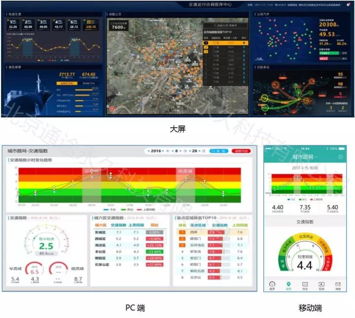 针对领导、行业管理者、企业用户、社会公众的应用习惯和关注重点的不同,配置指挥大屏端、监测端、移动端三种展示方式。基于指挥大屏,将领导关注的重点拖拽到一张屏中集中展示,全面掌握综合交通运行状况并进行多方指挥协调;基于监测屏,用户可实时关注交通运行动态,掌握其变化态势;基于移动屏幕,则可随时随地关注交通动态,不受时空限制进行在线决策和业务办理。