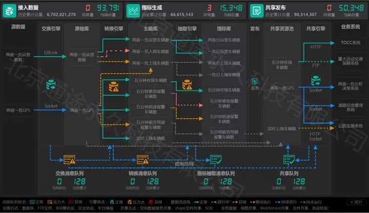 综合交通覆盖领域广,接入数据量大,数据结构复杂多样,基于链条式数据管理应用服务技术,实现数据接入监控、数据量异常监控、数值异常监控、服务进程监控、异常处理、数据追溯等,完成从源数据到目标数据的综合交通数据质量全生命周期监控与管理。