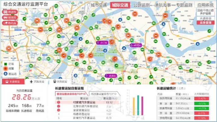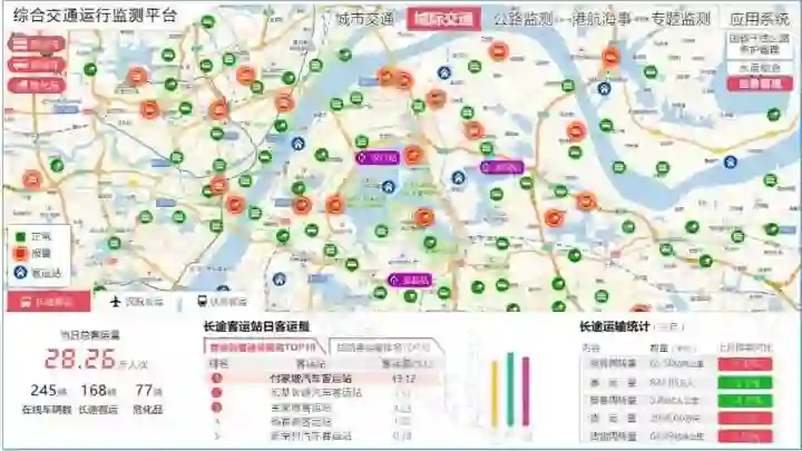 采用折线图反映交通量、客运量等指标的小时变化趋势,环形图反映各高速公路客运量的占比,迁徙图展示航班的飞行动态,热力图展示客流分布等,将复杂的交通状态更加直观地展示出来。