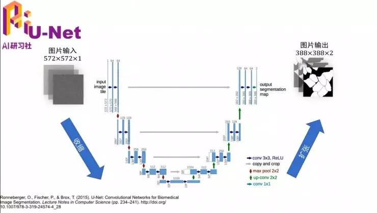 我下面补充一下这个U-Net的概念,如果没有医学图像切割的一些知识背景的话,可能不太理解它。其实U-Net就是一个网络结构,参考文献在最下面。这种网络结构,就是画出来长得字母U,然后所以叫yU-Net。