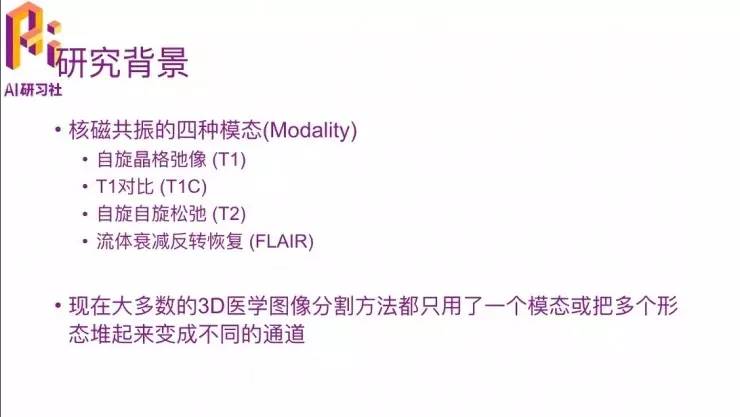 刚才提到多模态的概念,就是因为这个是MRI特有的特征,因为CT里面并没有。这里有四个模态,就是通过四种方式扫描脑部得到MRI数据,这是这里列出来的四个的名字,我们先不用管它这四个具体是什么意思,只是知道它有四种模态就行了,这四种模态对最终切割的结果是有直接的作用的。现在大多数的3D图像切割方法只是用了一个模态,或者把多个模态分别来做,然后再堆积起来。