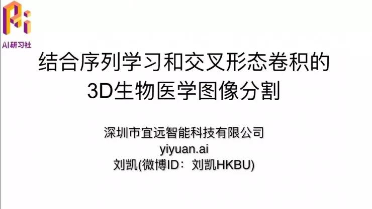 刘凯博士:大家好,我是深圳市宜远智能科技有限公司的刘凯,我们的官网是 yiyuan.ai。这里也有我的微博ID,我经常会发一些跟人工智能相关的资料和文章,大家可以关注一下。今天讲的也是关于生物医学图像的应用,是结合序列学习和交叉模态卷积的3D生物医学图像分割。其实在医学图像方面,分割,英文是segmentation,是非常重要的工具或者应用。