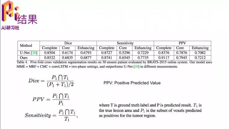 这里有从三个方面看的评价结果,三个指标。其实都是算它切割得跟ground truth重合的部分的比例,第一种“Dice”就是它的 overlap 部分,除以他们两个面积交集和并集的一个平均,这里的P就是predict出来的区域,然后T是ground truth的区域。PPV是positive predicted value,那是他的交集部分除以预测的区域;sensitivity就是交集的面积除以ground truth区域。这里也是跟U-Net比较了一下。