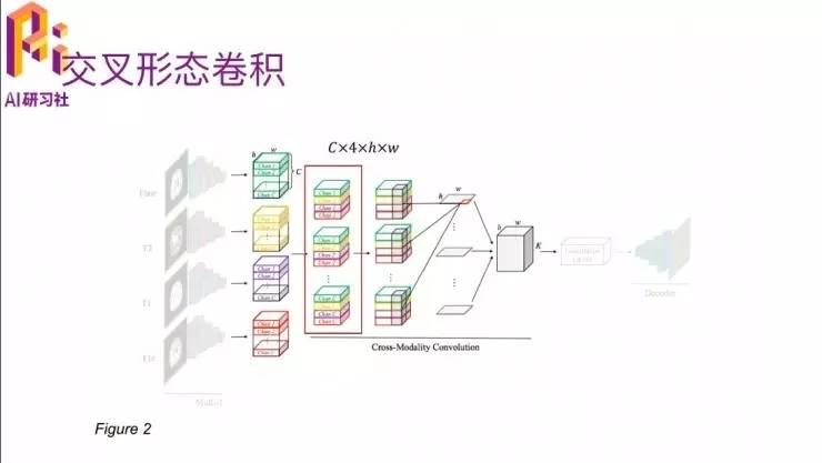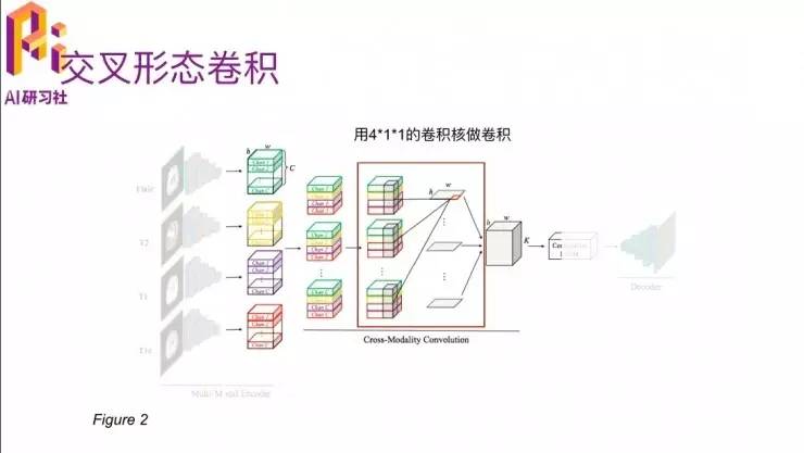 另外一个嗯比较重要的部分就是多模态交叉卷积。四个模态的数据进入到这个卷积网络之后,他就会把每一个模态下面的cross在一起,然后通过一个三维的卷积,卷积的大小里有个C×4,就是因为他每个channel里面有 c 个slice,就是说它是一个立体结构了,一个长宽是H、W,高是C的这种。四个模态弄到一起就是C×4×H×W,有大小。