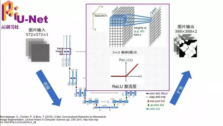 它之所以长成这样,是因为这个图像进来,最左边可能大家看的不是很清楚,图像里其实是一个一个的细胞,它们都连在一起,但是边缘是有一些线割开的。网络的目标是把这些细胞一个一个地切开,就像最右边的这种情况。网络刚开始的时候用的卷积就先是3×3的卷积,然后加上ReLu这个非线性变换,然后一步一步做下去。其实这个网络结构还是挺深的,如果有兴趣可以去看一下这篇文章。其实这个算法对大物体小物体的切割都是做得还不错的,就是因为这种U结构的,先对大物体切割,然后再去对小物体切割。