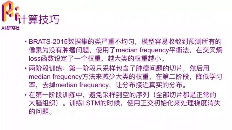这里面还有一些trick,就是在BRATS-2015这个数据上来,因为这个数据量其实不大,好像正例一共只有60多个,负例两百多个。这里也出现了一个数据不均衡的问题,它是用median frequency平衡法,这个很简单,这个算式里有一个除法,就是分子式median frequency,就是每一个类的平均frequency,除以这一类总的出现的次数。如果出现次数越多,那它这个权重就会越小,就是赋了一个比较小的权重,就在 loss 函数里对这一类的数据设定了一个权重,相当于下采样的过程。