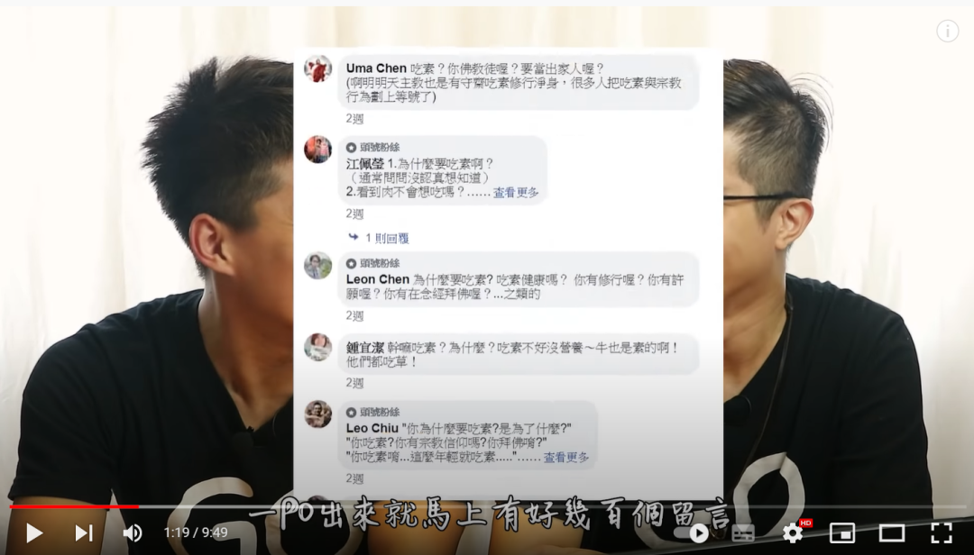 刺猬公社(ID:ciweigongshe)还访问了其他素食者,“我65岁,吃素10年,55岁之前脑梗两次,我为了健康开始吃素”“我44岁,吃素8年,2013年,我妻子怀孕时梦到她怀里的小猪仔变成一个婴儿,从那时起我们不再吃肉”“我37岁,吃素4年,做影视工作时,我看过不少相关纪录片,后来又发现喜欢的导演是素食者,而且男朋友也吃素,在我完全认可素食理念后,只用两星期就成了素食者”。