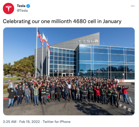 【特斯拉宣布已生产100万块4680电池】