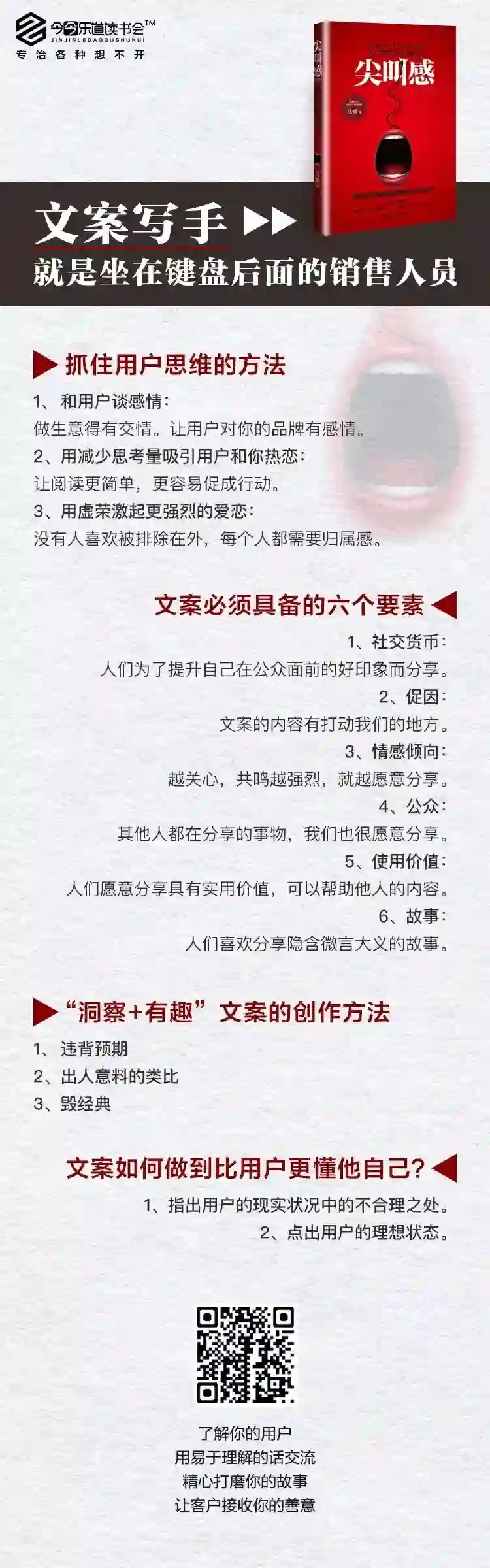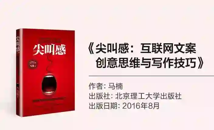 对于广告文案,本书作者马楠是这样说的:“性感、狗血、噱头、文艺范、耍酷、卖萌、原创……完全没有用!因为没有人愿意看你的自嗨。卖点、卖点、还是卖点!移动互联网时代要的是一案成交。”《尖叫感:互联网文案创意思维与写作技巧》专门针对互联网普及的当下,以作者本人的实践为基础,结合了心理学和影响力理论,提出了互联网时代产品文案的思维方式和写作技巧。这本书得到了腾讯、百度、美团、滴滴等互联网大咖的强力推荐,被称为是“献给互联网创意人的厚礼”。