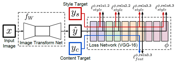 风格迁移网络主要是来自于2016李飞飞等提出感知损失的图像风格迁移与超分辨率论文实现的,网络结构如下: