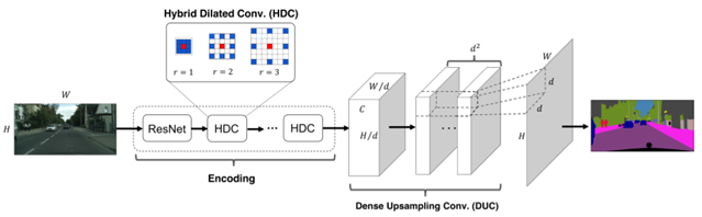 该模型在编码网络中基于残差网络与混合空洞卷积(HDC-Hybrid Dilated Convolution),在解码阶段采用密集上采样卷积(DUC-Dense Upsampling Convolution),最终实现了像素级别的图像语义分割网络。网络模型结构如下: